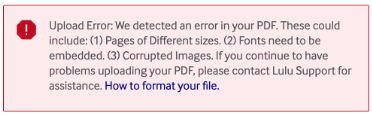 Creating your own book can result in some common errors in the publishing process. This article will walk you through some of the common error messages and how to correct them.One way to locate the information you are seeking is to Crtl+F (Command+F for Mac) in this article. Our Knowledge Base is filled with articles and resources to get you right back on track to publishing and sharing your work.TABLE OF CONTENTSAbout Errors and WarningsLogin PageInvalid Username or PasswordProject Creation Tool: Start StepChanging Product Type After Publishing Your BookChanging Product Type After Ordering Proof CopyNot Eligible for Global DistributionProject TitleBook LanguageBook CategoryCopyright StepTitle and Edition (Ebook Only)ContributorsISBN RequiredISBN Not RequiredISBN ChangesISBN ImprintISBN In UseISBN Format IncorrectFull Imprint Contact DetailsDesign StepBook SizeUnsupported Book SizeProduct Type MismatchPage LayoutEmbed FontsFont SizeUpload ErrorTransparencyImage ResolutionInk Coverage (Error)Ink Coverage (Warning)Page Count Not Eligible for DistributionUploaded Cover SizeUploaded Cover Page CountEbook Cover Image SizeFull BleedDetails StepDescription RequiredCategory RequiredBISAC Main Category RequiredKeyword RequiredPricing & Payees StepDesign Step IncompletePrice Too LowReview StepEbook Errors DetectedMy Projects PageProof Copy PurchaseCheckout PageInvalid Zip CodeInvalid Discount CodeNo Items Qualify for a DiscountPayment Details Couldn’t Be VerifiedBookstoreExplicit ContentAbout Errors and WarningsErrors are issues preventing you from completing an action, like publishing a project or placing an order.Warnings are issues that may affect the result of the action you want to complete, but they can be ignored, like getting an image resolution warning on an interior file.Errors are more serious than warnings, and errors MUST be addressed (most times appear in RED). Warnings can be thought of more as suggestions (most times appear in ORANGE).If you choose to ignore a warning, you are responsible for any imperfections or undesirable results.Informational notices give you status updates (most times appear in PURPLE).Note: If you need a visual aid of how to correct these errors and warnings, please refer to our Youtube page which has detailed tutorials.Login PageInvalid Username or PasswordMessage received: Invalid username or password.Severity: ErrorMeaning: Your email address and/or password are incorrect.Necessary actions: Try logging into your account with the correct login information. If you do not remember your password, you can request a password reset on the login page.Project Creation Tool: Start StepChanging Product Type After Publishing Your BookMessage received: Product Type can't be updated after publishing your BookSeverity: InformationalMeaning: You cannot change your project’s product type once you have published your project.Necessary actions: NoneChanging Product Type After Ordering Proof CopyMessage received: Product Type can’t be updated after approving a proof copySeverity: InformationalMeaning: You cannot change your project’s product type once you have approved a proof copy (for Global Distribution).Necessary actions: NoneNot Eligible for Global DistributionMessage received: Your Book is currently not eligible for Global Distribution. You can edit your selections on the Design step to enable this option.Severity: InformationalMeaning: The product type, book size, and/or book specifications of your project are not eligible for our Global Distribution service. You will not be able to select the Global Distribution goal unless you select eligible specifications for your project. See our Global Distribution Eligible Products Guide for more information.Necessary actions: NoneProject TitleMessage received: Project title is requiredSeverity: ErrorMeaning: You did not enter a project titleNecessary actions: Enter a project titleBook LanguageMessage received: Language is requiredSeverity: ErrorMeaning: You did not enter a book languageNecessary actions: Select a book languageBook CategoryMessage received: Category is requiredSeverity: ErrorMeaning: You did not select a categoryNecessary actions: Select a categoryCopyright StepTitle and Edition (Ebook Only)Message received: Title entered does not match the title detected in the ebook fileSeverity: ErrorMeaning: For ebook projects in our Global Distribution program, it is required that the title entered in the Copyright step matches the title detected in the EPUB file.Necessary actions: Either edit the title in the Copyright step to match the title in the EPUB file OR edit the title in the EPUB file to match the title in the Copyright step.ContributorsMessage received: At least one contributor is required to publishSeverity: WarningMeaning: You must add at least one contributor (author, artist, translator, etc) to your project.Necessary actions: Add at least one contributor to your project.ISBN RequiredMessage received: ISBN required for Global DistributionSeverity: WarningMeaning: You must assign an ISBN to your project if you’d like to sell your book through Global Distribution.Necessary actions: Assign an ISBN to your project.ISBN Not RequiredMessage received: If you are only selling your book on the Lulu Bookstore, an ISBN is not required. You can add an ISBN if you decide later to sell your book through Global Distribution.Severity: InformationalMeaning: It is optional to assign an ISBN to a project that is not in Global Distribution.Necessary actions: NoneISBN ChangesMessage received: ISBN can’t be updated after approving a proof copy.Severity: InformationalMeaning: You cannot change your ISBN, imprint, or contact details once you have assigned an ISBN and published your project.Necessary actions: NoneISBN ImprintMessage received: Imprint is already in useSeverity: ErrorMeaning: An imprint is the publisher's name attached to your ISBN. The imprint you have submitted is already being used by a Lulu user in a dif