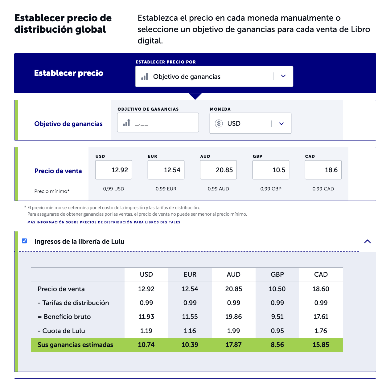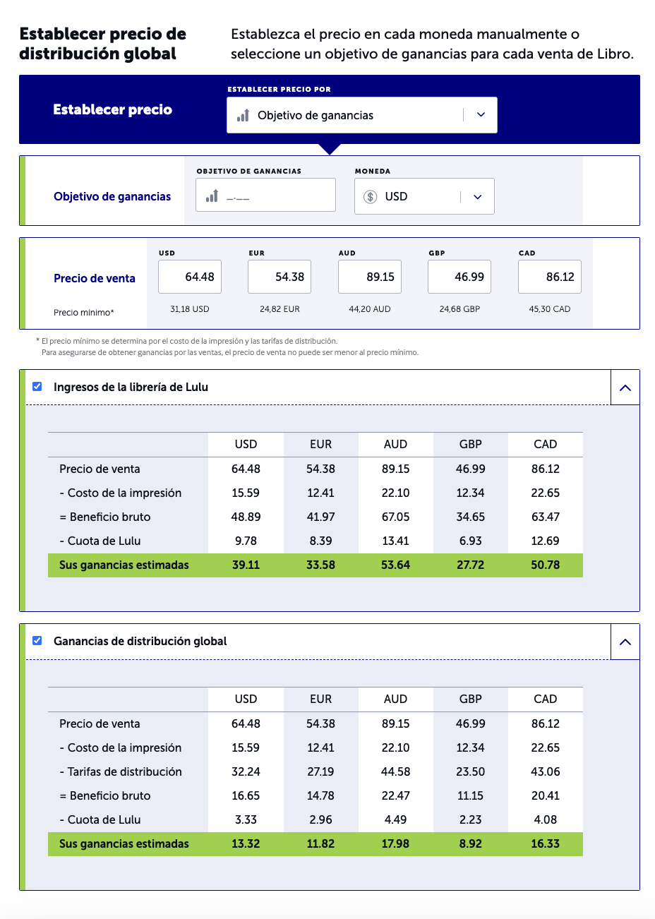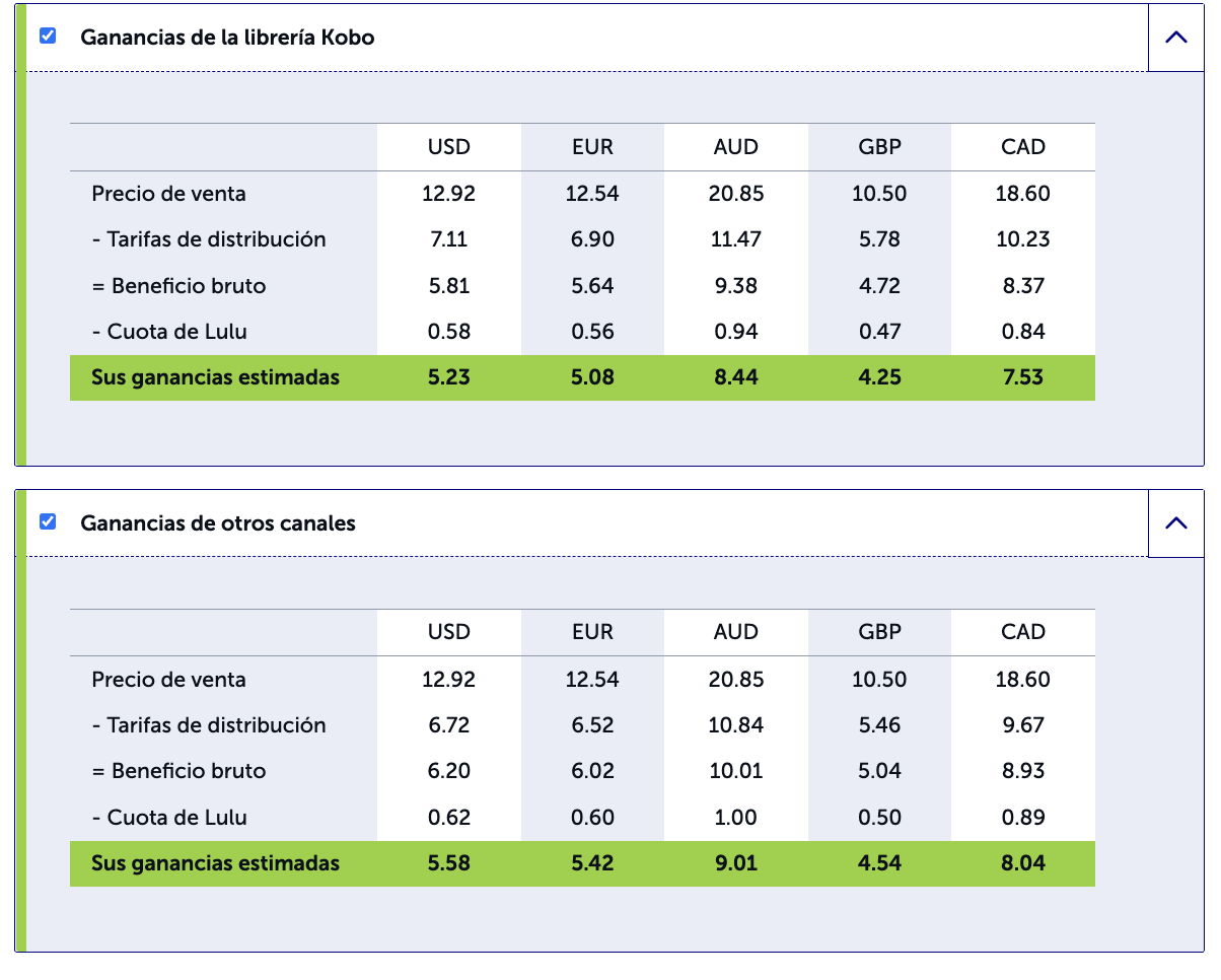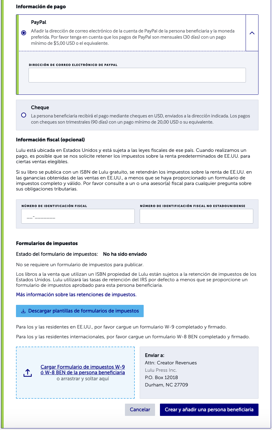 Al ser un servicio de auto-publicación gratuito y de impresión bajo encargo, Lulu no paga anticipos sobre el trabajo futuro de un autor o autora ni sobre sus ventas potenciales. En su lugar, los y las autoras son pagados en base a las ventas reales de su contenido publicado.Esta guía de ingresos para creadores y creadoras proporciona una visión general de cómo Lulu cobra, muestra y paga por su trabajo. También sirve de referencia y recurso para darle las herramientas necesarias para tomar el control de sus publicaciones y gestionar cualquier beneficio con mayor éxito.Tabla de contenidosIngresos y regalíasPersonas beneficiarias y métodos de pagoPayPalCheque en papelGestión de sus personas beneficiariasRevisar una persona beneficiariaDividir los ingresosPágina de Ventas y pagosInformes de ventasResumen de pagosVendiendo su libroLa librería de Lulu versus la distribución globalPrecios de la distribución impresaPrecios de distribución de libros digitales en inglésOpciones alternativasIngresos y regalíasLa ganancia de la persona creadora es el monto total de dinero que usted obtiene por la venta de su material publicado. Esta ganancia incluye regalías y otros ingresos.Regalías:Cuando un creador o creadora establece la distribución global como objetivo del proyecto y a su material se le asigna un ISBN propiedad de Lulu, Lulu se convierte en la editorial de referencia y todos los ingresos se consideran derechos de autor o autora por ese material, independientemente del formato de entrega. Los ingresos de los y las creadoras generados por las ventas de material con un ISBN propiedad de Lulu se ajustan a la definición real y legal de una regalía. Las regalías se declaran al Servicio de Impuestos Internos (IRS por sus siglas en inglés) y están sujetos a retenciones de acuerdo con las leyes fiscales de los Estados Unidos de América.Otros ingresos:Si su libro no tiene un ISBN propiedad de Lulu, entonces sus ganancias no son regalías sino simplemente, "Otros ingresos", que es la cantidad de dinero que usted gana en cada venta de su material publicado. Los "otros ingresos" no están sujetos a retención y no se declaran al IRS.Para obtener más información sobre las retenciones fiscales, visite Impuestos y retenciones: Conceptos básicos.Personas beneficiarias y métodos de pagoLulu paga los ingresos de los y las creadoras mediante un cheque en papel o directamente en una cuenta de PayPal. Para recibir los pagos de los ingresos, usted debe tener una persona beneficiaria designada para su(s) proyecto(s), que puede ser configurada cuando se le pida en el paso de Precios y personas beneficiarias durante el proceso de creación. Si no tenemos una persona beneficiaria en nuestros archivos, no podemos enviarle los pagos de ingresos. Actualmente ofrecemos dos opciones de pago para los ingresos que obtenga: PayPal en su elección de 5 monedas disponibles O cheque en papel en USD solamente. En este momento, no ofrecemos transferencias bancarias o electrónicas, depósitos directos u otros métodos de pago.Nota: Dependiendo del tipo de cuenta de PayPal que tenga, PayPal puede deducir un cargo por servicio para el desembolso de sus ingresos de creador o creadora. PayPal determina esta tarifa. Lulu no tiene control sobre estas tarifas.Para más información, por favor revise el Acuerdo de membresía de Lulu.PayPalLos pagos de PayPal se pueden realizar en las siguientes monedas: USD, CAD, AUD, EUR y GBP.Si usted elige PayPal, le pagaremos a final de mes si ha generado al menos 5 dólares en ingresos acumulados en el mes anterior (después de la retención de impuestos). Por ejemplo, usted recibirá el pago el último día de febrero o antes si generó 5 dólares o más en ingresos a finales de enero, las ventas de febrero se pagarán a finales de marzo, y así sucesivamente.Usted debe tener todos los datos de la persona beneficiaria y del contacto completados en su cuenta. Asegúrese de entrar primero en el sitio de PayPal para crear su cuenta de PayPal allí antes de configurar su información de contacto de pago en Lulu.Estas transacciones son válidas durante 30 días antes de que caduquen y se conviertan en ingresos no pagados de su cuenta de Lulu. Si esto ocurre, usted recibirá los fondos de nuevo en la siguiente fecha de pago programada desde que el dinero volvió a su cuenta. Cheque en papelSi usted elige los cheques, le enviaremos un cheque físico en dólares estadounidenses por correo prioritario de EE.UU. si los ingresos acumulados son de al menos 20 dólares (después de la retención de impuestos). Los pagos con cheque se realizan en los 45 días siguientes al final de cada trimestre financiero (cada 3 meses). El umbral de 20 dólares debe cumplirse para las ventas de ese periodo de ingresos. Por ejemplo, los ingresos por ventas hasta el 31 de marzo deben sumar 20 dólares o más para recibir un pago antes del 15 de mayo.Los pagos con cheques en papel se realizan únicamente en dólares estadounidenses y se envían por correo prioritario de EE.UU. en las siguientes fechas:Antes del 15 de febrero (para las ventas de octubre, noviembre y diciembre)Antes del 15 de mayo (para las ventas de enero, febrero y marzo)Antes del 15 de agosto (para las ventas de abril, mayo y junio)Antes del 15 de noviembre (para las ventas de julio, agosto y septiembre)Usted debe tener todos los datos de la persona beneficiaria y del contacto completados en su cuenta.Estos cheques son válidos durante 90 días a partir de la fecha de emisión, después de ese tiempo caduca y es nulo. Una vez que un cheque se anula, los fondos vuelven a su cuenta y se incluirán con cualquier otro ingreso no pagado en la siguiente fecha de pago aplicable.Razones por las cuales Lulu no pudo realizar el pago:La información de pago que usted proporcionó es incorrecta, inválida o está desactualizada.La dirección de correo electrónico asociada a su cuenta de PayPal no tiene un formato válido (enlaces como PayPal.Me 